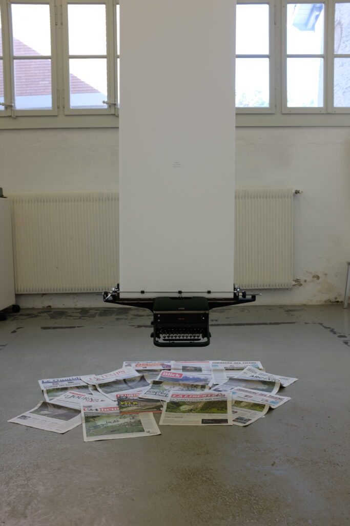 Installation avec six feuilles métal dactylographiées à la machine à écrire, table en bois, haut-parleurs à vibration.
